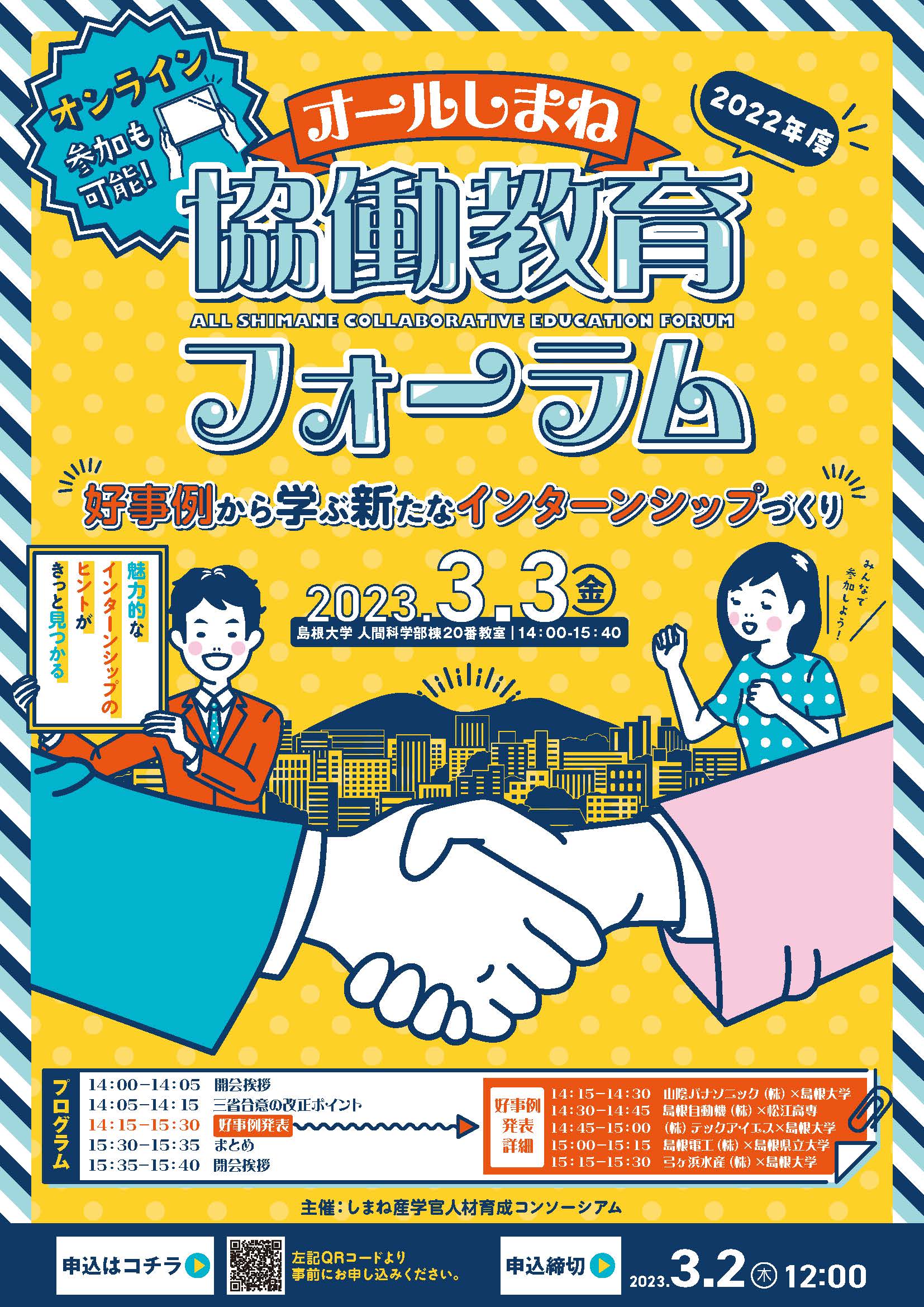 今回、三省合意の改正を受けて今後あり方が大きく変わっていくインターンシップについて、「好事例から学ぶ新たなインターンシップづくり」をテーマに「2022年度オールしまね協働教育フォーラム」を開催します。