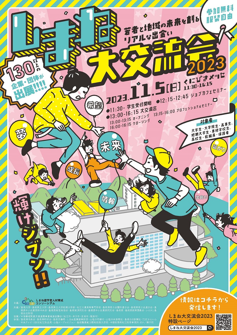 その取組の中で、島根県内の高等教育機関・教職員・一般企業を含む様々な立場の人々が一堂に会し、自身の魅力を発信し合うイベントとして「しまね大交流会2023」を11月5日(日)に開催いたします。