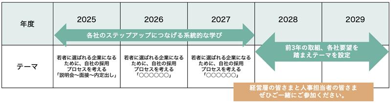 そこで、賛助団体の皆さまの人材確保・育成の取組に少しでもお役に立てるよう、共に学び、共に成長できる組織を目指して、次期5年間(2025~2029)は、これまでの取組に加えて、新たに「県内定着協働フォーラム」を継続的に開催することとしました。